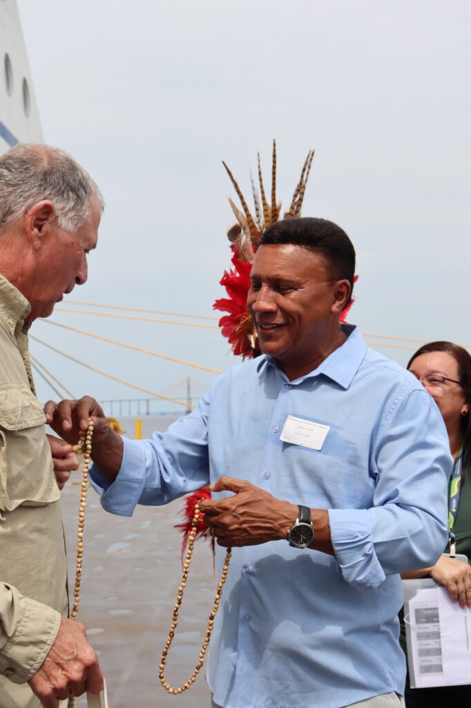Para receber os visitantes, uma equipe da Amazonastur distribuiu colares de sementes de açaí e mapas da cidade, com apresentação de dançarinos caracterizados de indígenas.